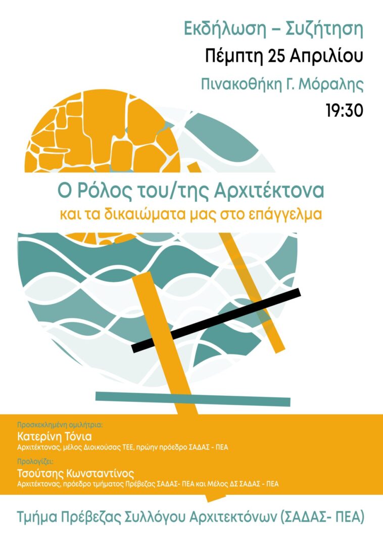 “Το τμήματος Πρέβεζας του Συλλόγου Αρχιτεκτόνων (ΣΑΔΑΣ-ΠΕΑ) σας προσκαλεί στην εκδήλωση με θέμα: «Ο ρόλος του/της αρχιτέκτονα και τα δικαιώματα μας στο επάγγελμα», την 25η Απριλίου στις 19.30 στην Δημοτική Πινακοθήκη Γ. Μόραλης στο κέντρο της Πρέβεζας.