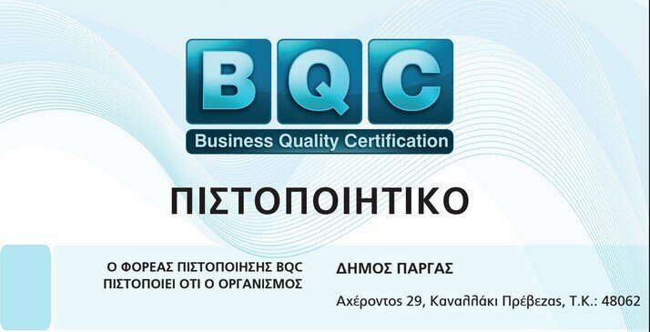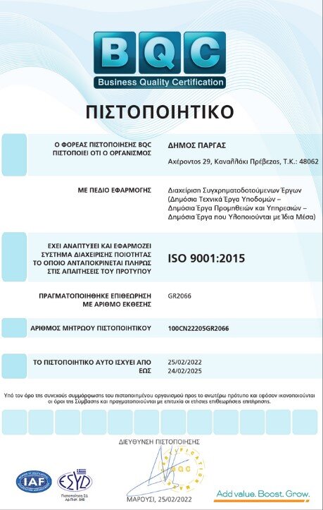 Στο πλαίσιο εκσυγχρονισμού και προσαρμογής στις νέες απαιτήσεις, ο Δήμος Πάργας αφού ολοκλήρωσε όλες τις απαιτητικές διαδικασίες που ξεκίνησε την τελευταία διετία, απόκτησε για πρώτη φορά πιστοποιητικό κατά το πρότυπο ISO9001:2015.