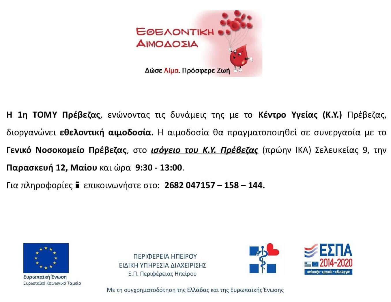 in Πρέβεζα Εθελοντική αιμοδοσία διοργανώνει το 1ο ΤΟΜΥ Πρέβεζας μαζί με το Κέντρο Υγείας Πρέβεζας την Παρασκευή 12 Μαΐου 2 Μαΐου 2023, 17:14 ΑιμοδοσίαΚέντρο Υγείας ΠρέβεζαςΤΟΜΥ See more Προηγούμενο άρθρο ΣΥΝΕΝΤΕΥΞΗ | «”Ταξίδι στο κράτος” ένας οδηγός πρώτων βοηθειών για το κράτος.», Δημήτρης Χριστόπουλος Επόμενο άρθρο Επιδότηση επιτοκίων στα στεγαστικά δάνεια | του Γιώργου Θεοδόση