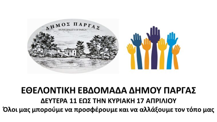 Ο Δήμος Πάργας σε συνεργασία με Τοπικές Κοινότητες και Συλλόγους διοργανώνει Εθελοντική Εβδομάδα με δράσεις σε όλο τον Δήμο από την Δευτέρα 11 έως την Κυριακή 17 Απριλίου. Στόχος της προσπάθειας μέσα από τις εθελοντικές ενέργειες είναι οι πολίτες με την συμπαράσταση του Δήμου να βελτιώσουν την εικόνα σε όλες τις Τοπικές Κοινότητες.