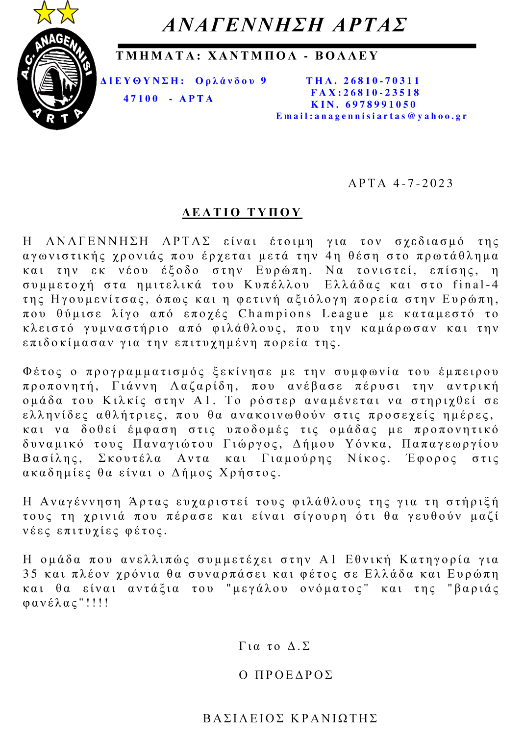 in Αθλητισμός, Άρτα Η Αναγέννηση Άρτας Handball για τη νέα αγωνιστική χρονιά 4 Ιουλίου 2023, 13:10 HandballΑναγέννησης Άρτας See more Προηγούμενο άρθρο ΔΗΜΟΣ ΠΑΡΓΑΣ | Επετειακή εκδήλωση για τη μάχη της Σπλάντζας στην Βαλανιδορράχη Επόμενο άρθρο Ορκίστηκε βουλευτής Πρέβεζας ο Σπύρος Κυριάκης