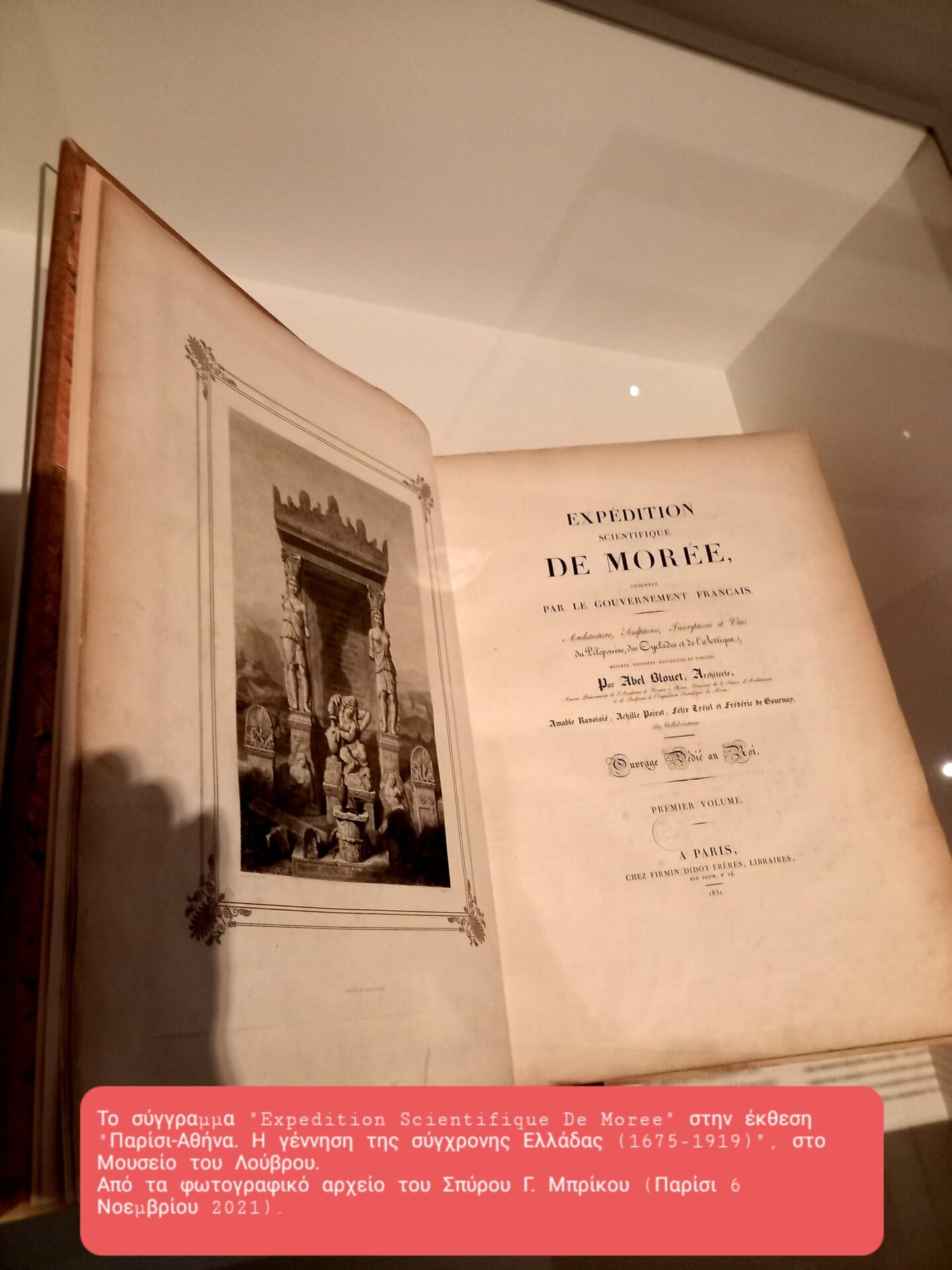 Οι Γάλλοι εκθέτουν και κάτι άλλο ακόμα σπουδαίο στο αφιέρωμά τους για τα 200 χρόνια από την Ελληνική Επανάσταση. Το έκθεμα ονομάζεται «Expedition de Moree», στα γαλλικά. «Εκστρατεία του Μοριά», στα ελληνικά. Και το πρωτότυπο σύγγραμμα που παρουσιάζεται στην έκθεση έχει τον τίτλο «Expedition Scientifique De Moree». Αναφέρεται στην αποστολή γαλλικού εκστρατευτικού σώματος στην Πελοπόννησο μεταξύ των ετών 1828 και 1833 κατά τη διάρκεια της Ελληνικής Επανάστασης του 1821 με σκοπό την απελευθέρωση της περιοχής από τις τουρκικές-αιγυπτιακές κατοχικές δυνάμεις, που συνοδεύτηκε από μία καλά οργανωμένη επιστημονική εκστρατεία με εντολή της Γαλλικής Ακαδημίας. Μία γαλλική εκστρατευτική δύναμη 15.000 ανδρών υπό την αρχηγεία του στρατηγού Nicolas–Joseph Maison. Όπως και στην Εκστρατεία της Αιγύπτου του Ναπολέοντα Βοναπάρτη, όπου μια επιτροπή Επιστημών και Τεχνών συνόδευσε την ίδια τη στρατιωτική εκστρατεία, στην Πελοπόννησο μία επιστημονική επιτροπή η «Επιστημονική Αποστολή του Μοριά» (Mission Scientifique De Moree) επίσης ακολουθούσε τα στρατεύματα. Μέρος της αποστολής ήταν 19 επιστήμονες οι οποίοι εκπροσώπησαν διαφορετικές ειδικότητες όπως φυσική ιστορία, αρχαιολογία, αρχιτεκτονική-γλυπτική. Το έργο τους αποδείχθηκε ιδιαίτερα κρίσιμο για την τρέχουσα ανάπτυξη του νέου ελληνικού κράτους και αποτέλεσε ορόσημο στην ιστορία της σύγχρονης Αρχαιολογίας. Το 1846 ιδρύεται η Γαλλική Αρχαιολογική Σχολή και στη συνέχεια και άλλα ξένα αρχαιολογικά ινστιτούτα. Για να ακολουθήσουν οι οργανωμένες πια ανασκαφές στη Δήλο, τους Δελφούς, και την Ακρόπολη. Το τερπνόν -ανά τους αιώνες- μετά του ωφελίμου…