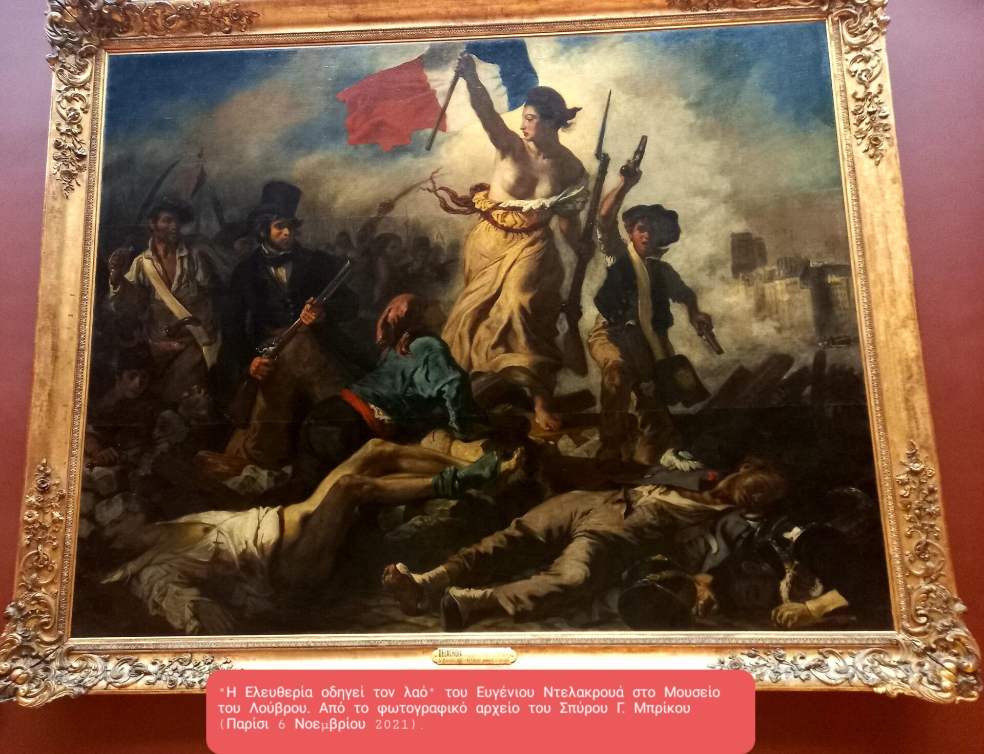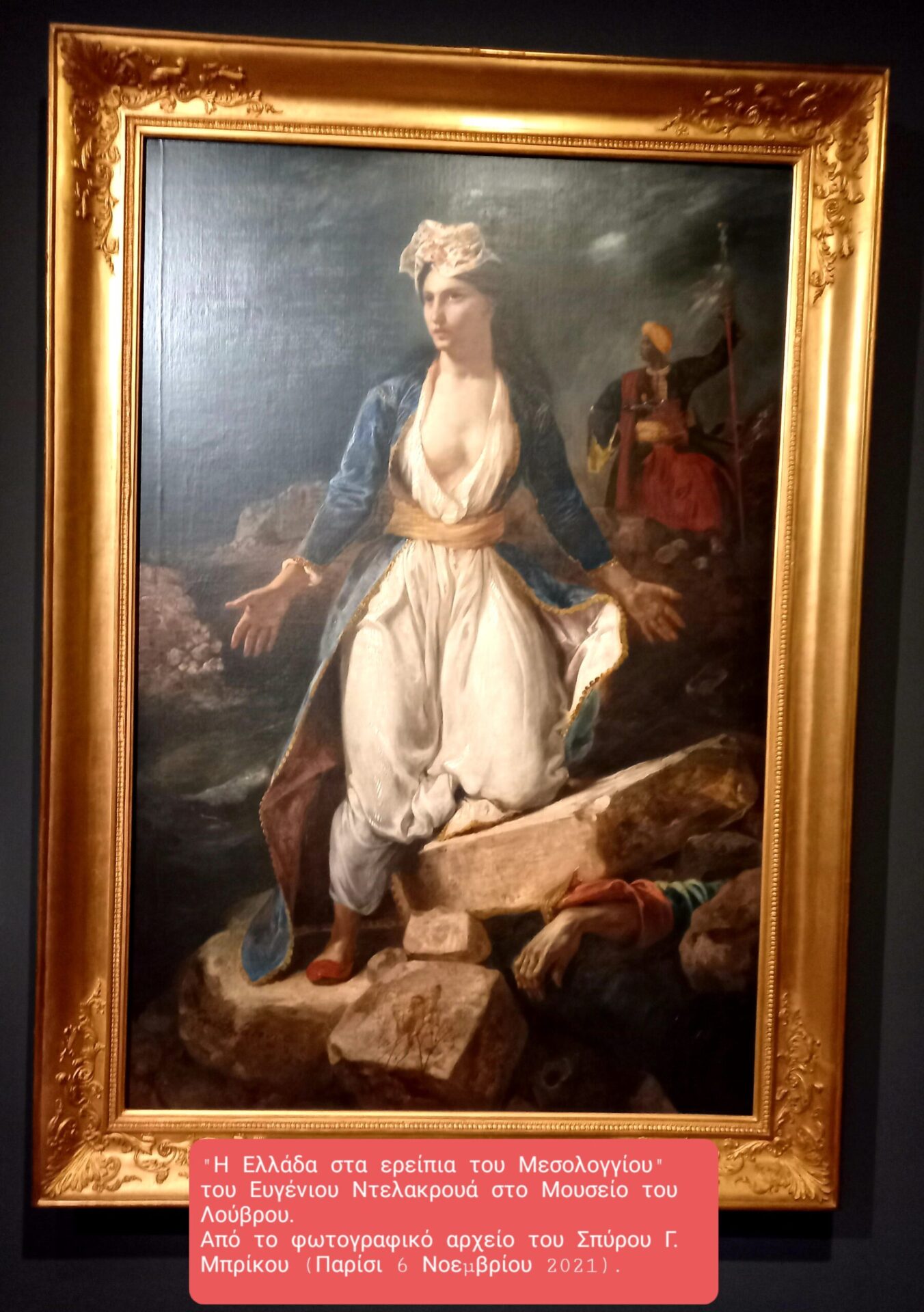 Η σπουδαία αυτή έκθεση «Παρίσι-Αθήνα. Η γέννηση της σύγχρονης Ελλάδας, 1675-1919», που πυροδότησε έναν μεγάλο κύκλο συνειρμών στον περιηγητή και συντάκτη αυτού του κειμένου, κοσμείται επίσης από πίνακες του τρομερού Γάλλου ζωγράφου Ευγένιου Ντελακρουά με το πολύ γνωστό έργο του που παριστάνει τη γυναίκα-Ελλάδα στα ερείπια του Μεσολογγίου. Δεσπόζει άλλωστε η γυναικεία φιγούρα στους Γάλλους ζωγράφους και ειδικά στον Ντελακρουά με τη γυναίκα-Ελευθερία να οδηγεί τον λαό στον πασίγνωστο ομότιτλο πίνακα. Η Μαριάν (Marianne) άλλωστε είναι η αλληγορική μορφή της Γαλλικής Δημοκρατίας. Είναι η γυναικεία φιγούρα με τον φρυγικό σκούφο, ένα εθνικό σύμβολο, που κατέχει τιμητική θέση στα επίσημα κτήρια της Γαλλίας. Εκπροσωπεί τις αξίες τις Γαλλικής Επανάστασης. Ελευθερία, Ισότητα, Αδελφοσύνη. Στο Πάνθεον του Παρισίου είναι εμβληματικά τα γυναικεία αγάλματα, το κεντρικό (με την επιγραφή: La Convention Nationale) να κρατά σπαθί στο χέρι συμβολίζοντας την τρίτη κυβέρνηση της Γαλλικής Επανάστασης (την Συμβατική Εθνοσυνέλευση), και άλλα γυναικεία γλυπτά και αγάλματα που παρουσιάζονται να προτάσσουν τα στήθη τους. Το Πάνθεον είναι φανερό πως λειτουργεί ως ένα μη θρησκευτικό μαυσωλείο μιας και η τομή της Γαλλικής Επανάστασης ήταν τόσο βαθιά στο εποικοδόμημα, δηλαδή στους θεσμούς, τις αντιλήψεις και στις ιδέες της κοινωνίας, ώστε οι εθνικοί τους ήρωες (και σε αυτούς συμπεριλαμβάνονται οι επιστήμονες, οι συγγραφείς, οι φιλόσοφοι και όχι μόνο οι στρατηγοί) να μην «ανακατεύονται» με τη μεταφυσική και τα θρησκευτικά πιστεύω, πόσο μάλλον με τη θεσμοθετημένη θρησκευτική εξουσία που λύνει και δένει σε τριτοκοσμικά κράτη τύπου σύγχρονης Ελλάδας, όπως και αλλού!