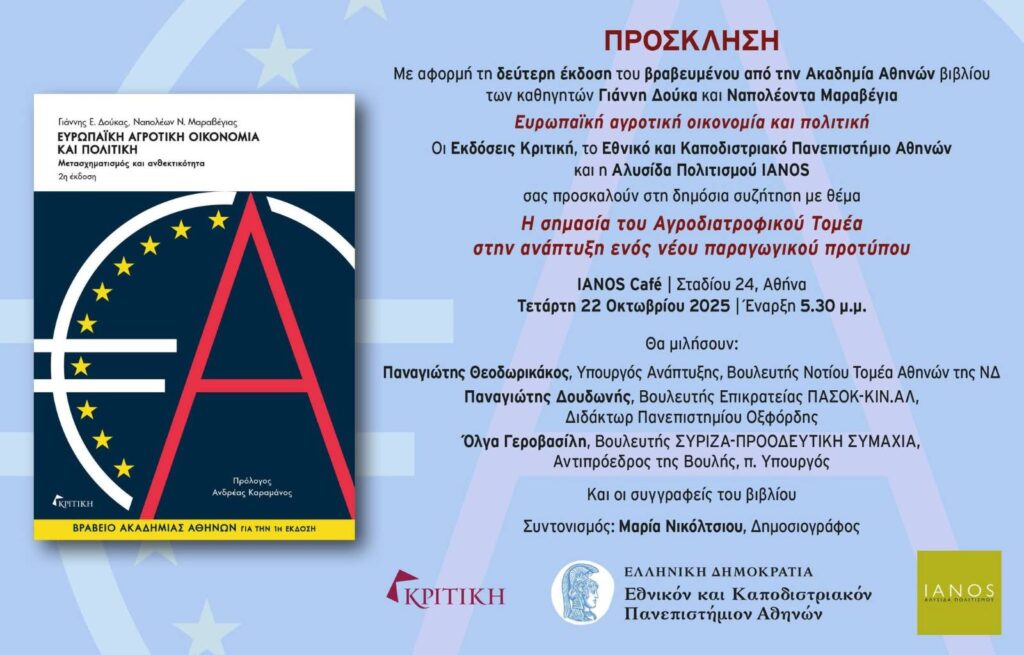 Σημεία από την Τοποθέτησή μου κατά τη χθεσινή δημόσια συζήτηση με θέμα: «Η σημασία του Αγροδιατροφικού Τομέα στην ανάπτυξη ενός νέου παραγωγικού προτύπου», με αφορμή τη δεύτερη έκδοση του βιβλίου των καθηγητών Γιάννη Δούκα και Ναπολέοντα Μαραβέγια με τίτλο: «Ευρωπαϊκή αγροτική οικονομία και πολιτική».