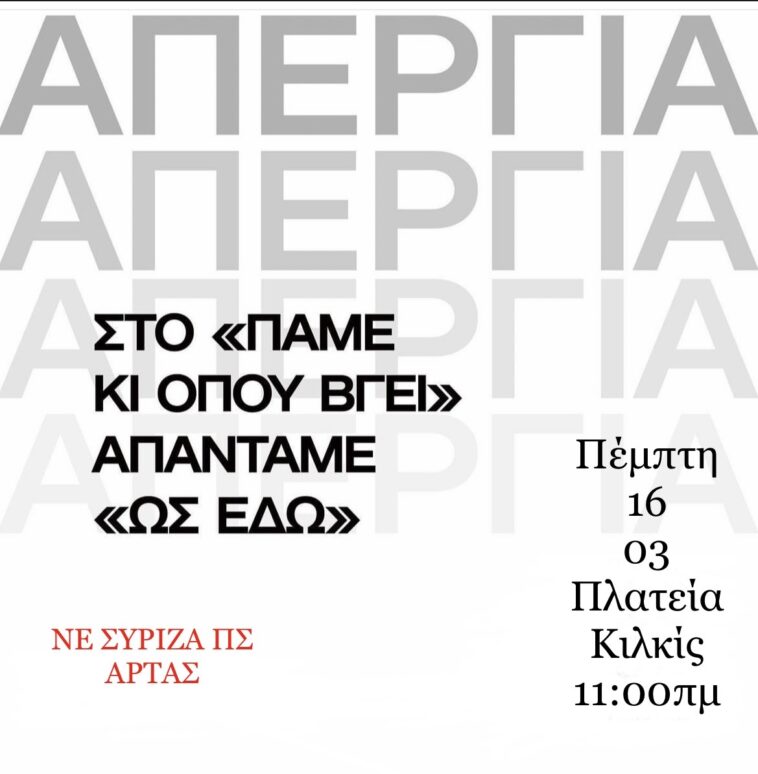 Στηρίζουμε και συμμετέχουμε στην μεγάλη πανελλαδική και πανεργατική απεργία την Πέμπτη 16/3, ώρα 11:00πμ στην Πλατεία Κιλκίς στην πόλη της Άρτας.
