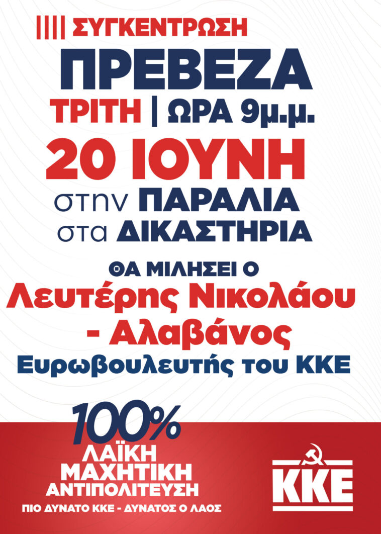 Η Τ.Ο. Πρέβεζας του ΚΚΕ σας καλεί στην κεντρική προεκλογική συγκέντρωση την Τρίτη 20 Ιουνίου, στις 9 μμ., στην Παραλία, στα Δικαστήρια με ομιλητή τον Λευτέρη Νικολάου-Αλαβάνο, ευρωβουλευτή του ΚΚΕ.