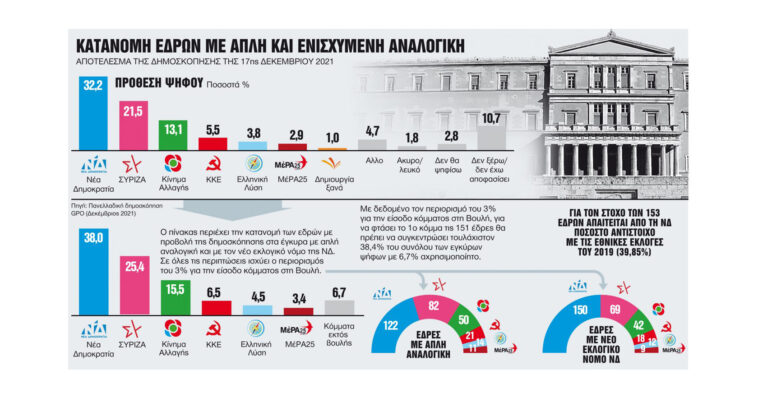 Χρησιμοποιώντας ως βάση ανάλυσης τα αποτελέσματα της τελευταίας δημοσκόπησης της GPO (Δεκέμβριος 2021), το σενάριο της προοδευτικής διακυβέρνησης με την απλή αναλογική που προωθεί ο Αλέξης Τσίπρας καθίσταται εφικτό μόνο με τη συμμετοχή τεσσάρων κομμάτων (ΣΥΡΙΖΑ, ΚΙΝΑΛ, ΚΚΕ, ΜέΡΑ25), ενώ είναι πλέον ξεκάθαρος ο ρυθμιστικός ρόλος του ΚΙΝΑΛ που τοποθετείται στο κέντρο των εξελίξεων σε μια πολύ δύσκολη εξίσωση με εκατέρωθεν πιέσεις.