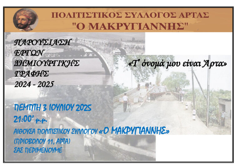 in Άρτα, Πολιτισμός & Παιδεία ΜΑΚΡΥΓΙΑΝΝΗΣ ΣΥΛΛΟΓΟΣ – πρόσκληση 2 Ιουλίου 2025, 09:10 See more Προηγούμενο άρθρο Η Χορωδία Πρέβεζας “Αρμονία” στο 4ο Διεθνές Φεστιβάλ Ηγουμενίτσας Επόμενο άρθρο ΑΠΟΛΟΓΙΣΜΟΣ ΔΗΜΟΤΙΚΗΣ ΑΡΧΗΣ ΕΤΟΥΣ 2024