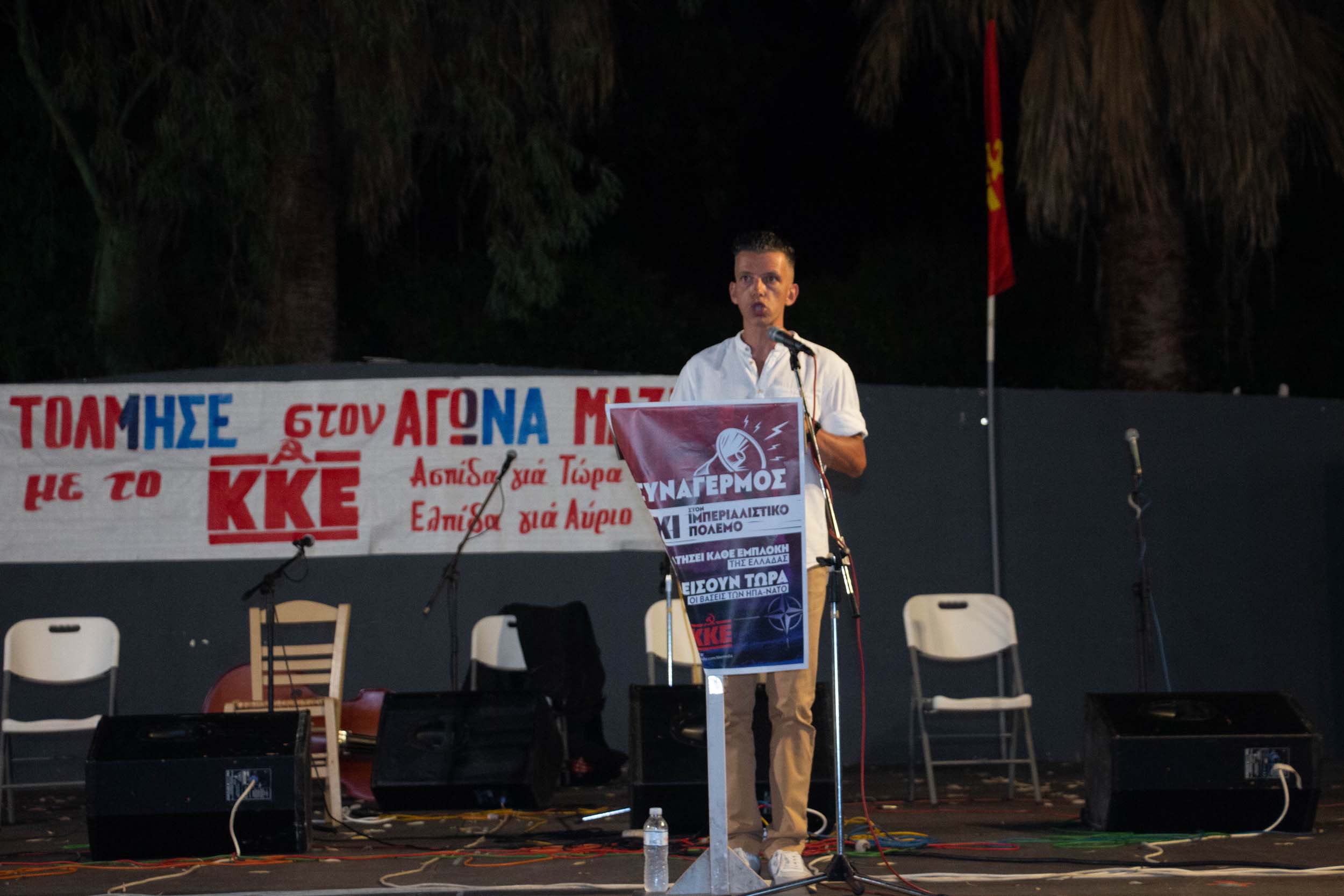 Η βραδιά ξεκίνησε με ομιλία από τον Κώστα Ηλία, μέλος του Γραφείου της Επιτροπής Περιοχής Ηπείρου – Κέρκυρας – Λευκάδας του ΚΚΕ. Αρχικά εξέφρασε τη συμπαράσταση και αλληλεγγύη σε όσους πλήττονται από τις καταστροφικές πυρκαγιές. Όπως είπε: «Η “ετοιμότητα” και η “επάρκεια” γύρω από την αντιπυρική προστασία που διατυμπανίζει η κυβέρνηση έχουν γίνει στάχτη από την ίδια την πραγματικότητα, τις πυρκαγιές με τις τεράστιες καταστροφές που άφησαν στο πέρασμά τους σε δασικές εκτάσεις, αγροτικές περιοχές και κατοικίες.» Τόνισε πως όλα τα παραπάνω με τα οποία ο λαός μας έρχεται αντιμέτωπος κάθε καλοκαίρι αποτελούν ένα προδιαγεγραμμένο έγκλημα, στο οποίο έχει συμβάλει τόσο η σημερινή όσο και όλες οι προηγούμενες κυβερνήσεις. Συνέχισε λέγοντας πως: «…όλες οι κυβερνήσεις, διατηρούν τον απαράδεκτο αντιεπιστημονικό διαχωρισμό της πρόληψης των δασικών πυρκαγιών από την αντιμετώπισή τους, την καταστολή τους. Μιλάνε για επάρκεια όταν από τα 17,7 εκατομμύρια ευρώ που συνολικά ζήτησαν τα δασαρχεία όλης της χώρας για έργα αντιπυρικής θωράκισης μέχρι σήμερα έχουν δοθεί μόλις 1,7 εκατομμύρια ευρώ για όλη την Ελλάδα, πολύ πιο κάτω δηλαδή και από τα περσινά. Βλέπετε για όλα έχουν βρει το βολικό άλλοθι. Φταίνε τα ακραία καιρικά φαινόμενα και η κλιματική κρίση. Η σημερινή κυβέρνηση όπως και οι προηγούμενες κωφεύουν τα αυτιά του στις προτάσεις του ΚΚΕ. Σας καλούμε να πιέσετε και εσείς από την πλευρά σας τώρα να γίνουν οι αναγκαίες προσλήψεις για να καλυφθούν τα 4000 κενά στους μόνιμους πυροσβέστες και τα 1.500 κενά επιστημονικού προσωπικού στη δασική υπηρεσία. Να μονιμοποιηθούν όλη οι πενταετής, επταετής και εποχικοί πυροσβέστες. Τώρα άμεσα να γίνει η καταγραφή των ζημιών και η αποκατάσταση και αποζημίωση των πληγέντων στο 100% των καταστροφών τους».
