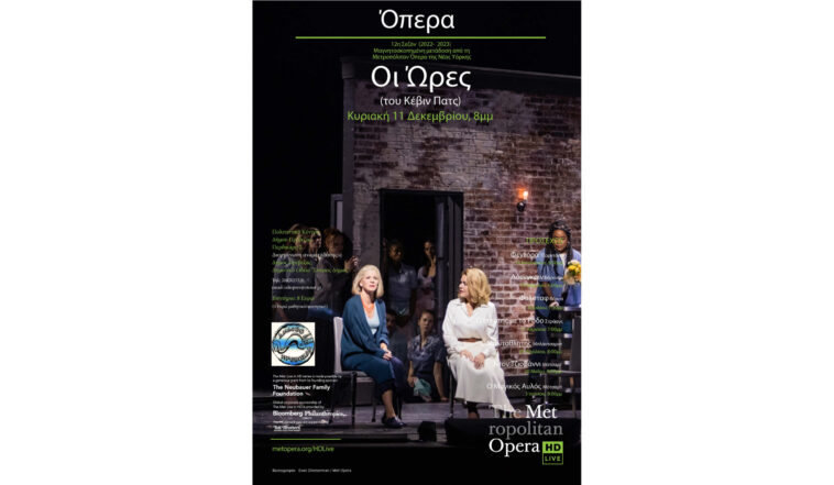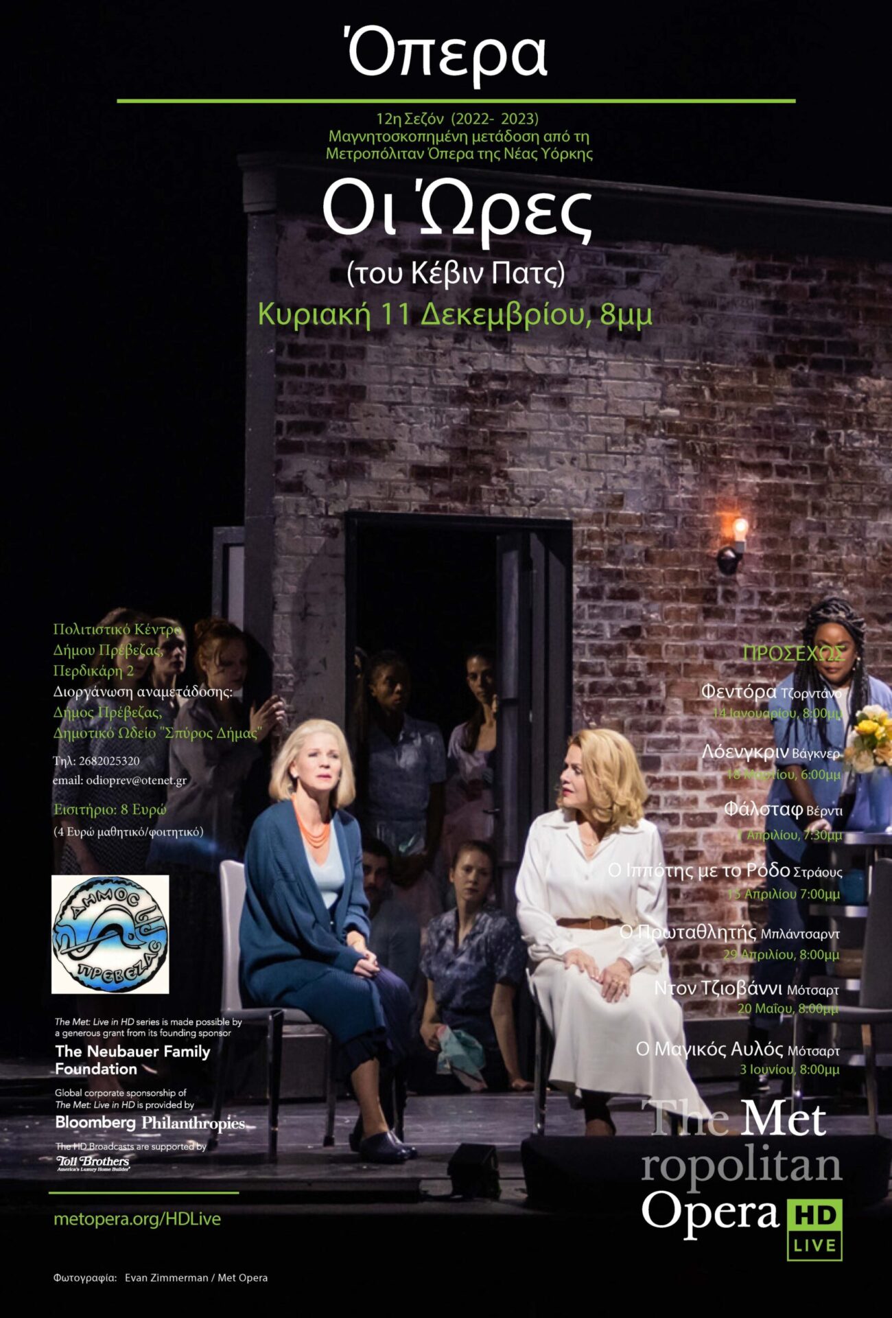 Οι μεταδόσεις από τη Μετροπόλιταν Όπερα της Νέας Υόρκης, που διοργανώνει και παρουσιάζει στην πόλη μας το Δημοτικό Ωδείο Πρέβεζας «Σπύρος Δήμας» συνεχίζονται την Κυριακή 11 Δεκεμβρίου στις 8μμ με την πολυαναμενόμενη όπερα του Κέβιν Πατς «Οι Ώρες».