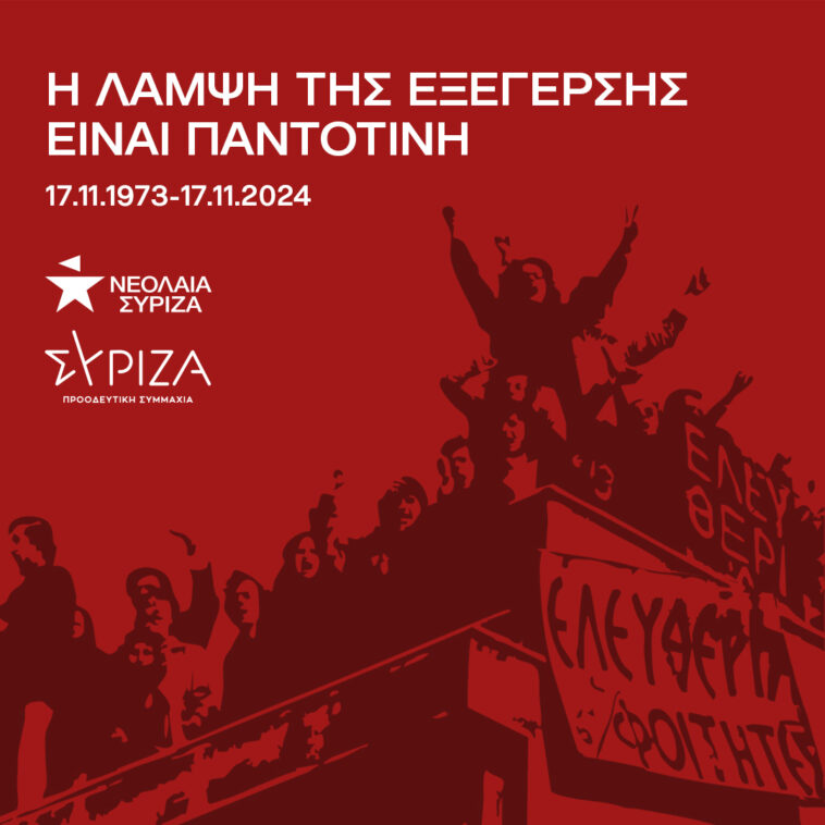 Καλούμε τους νέους και τις νέες, τους δημοκρατικούς πολίτες όλων των ηλικιών, να συμμετάσχουν μαζικά στις επετειακές εκδηλώσεις της 17ης Νοέμβρη και τις πορείες που θα γίνουν σε όλες τις πόλεις της χώρας.