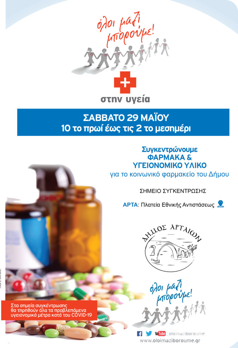 Ο Δήμος Αρταίων, σε συνεργασία με το ΟΛΟΙ ΜΑΖΙ ΜΠΟΡΟΥΜΕ, οργανώνει δράση με στόχο τη συγκέντρωση φαρμάκων και υγειονομικού υλικού, για την στήριξη και ενίσχυση του Κοινωνικού Φαρμακείου του Δήμου.