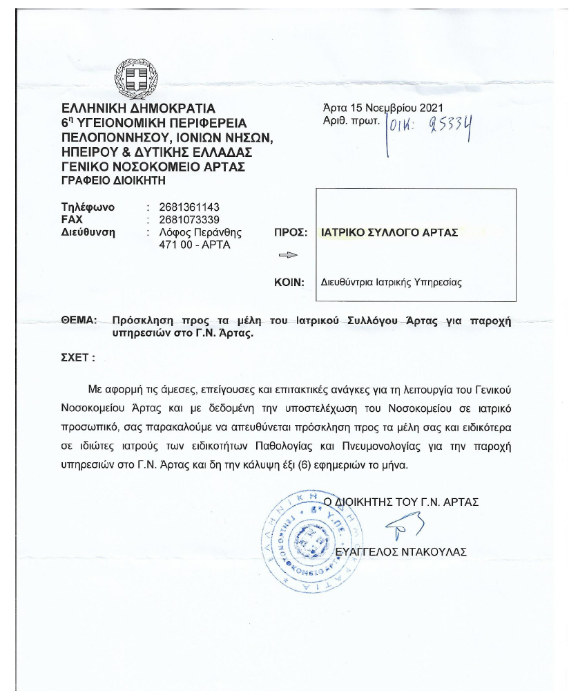 Ο κ. Ντάκουλας, Διοικητής του Γενικού Νοσοκομείου Άρτας, με επιστολή που έστειλε στον Ιατρικό Σύλλογο Άρτας ζητά την στήριξη των ιδιωτών Γιατρών της πόλης λόγω των οξυμένων προβλημάτων και εξαιτίας της υποστελέχωσης του Νοσοκομείου. Στην επιστολή ειδική αναφορά γίνεται για ειδικότητες Πνευμονολογίας και Παθολογίας.