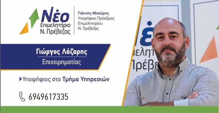 Ο Γιώργος Λάζαρης, Οικονομολόγος και πρώην τραπεζικό στέλεχος, είναι υποψήφιος στις επιμελητηριακές εκλογές του Νοεμβρίου για το τμήμα Υπηρεσιών με τον συνδυασμό “Νέο Επιμελητήριο Ν. Πρέβεζας”, με επικεφαλής τον Γιάννη Μπούρη.