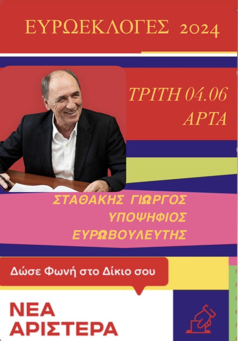 Ο υπ. ευρωβουλευτής της Νέας Αριστεράς Γιώργος Σταθάκης θα επισκεφτεί την πόλη της Άρτας, την Τρίτη 04.06 εν όψει των ευρωβουλευτικών εκλογών .