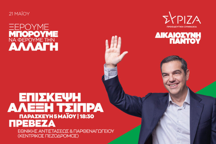 Ο Πρόεδρος του ΣΥΡΙΖΑ-ΠΣ Αλέξης Τσίπρας θα βρεθεί στην Πρέβεζα την ερχόμενη Παρασκευή 5 Μαΐου.