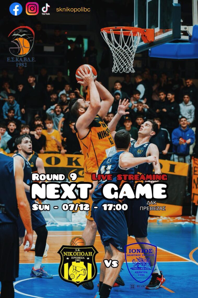 Ο Σύλλογος Καλαθοσφαίρισης Νικόπολη Πρέβεζας σας προσκαλεί την Κυριακή 7 Δεκεμβρίου 2025, στις 17:00, στον εντός έδρας αγώνα απέναντι στον ΑΣ Ιόνιος, μια ακόμη μπασκετική γιορτή γεμάτη ένταση, θέαμα και δυνατές στιγμές, στο ΔΑΚ Πρέβεζας.