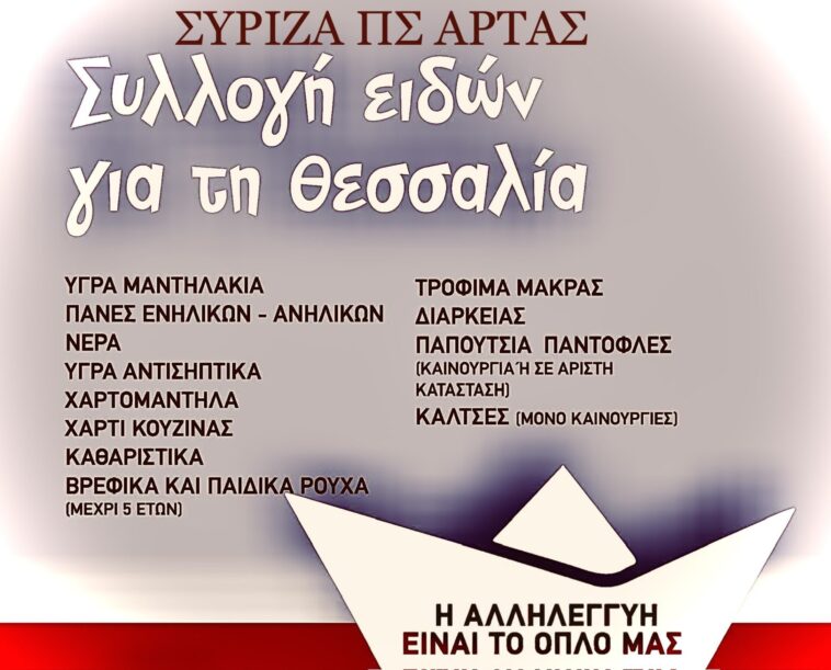 Ο ΣΥΡΙΖΑ ΠΣ Άρτας στέκεται αλληλέγγυος στους πλημμυροπαθείς των τριών νόμων της Θεσσαλίας που έχει σταματήσει η κανονική ζωή τους..