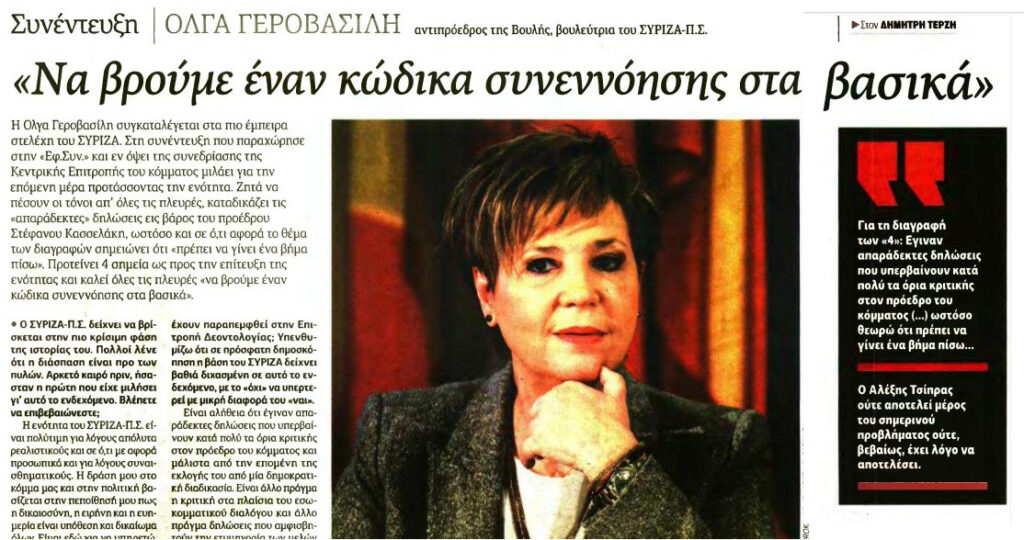 Συνέντευξη της Όλγας Γεροβασίλη, Δ’ Αντιπροέδρου της ΒτΕ και βουλευτή Άρτας του ΣΥΡΙΖΑ – Προοδευτική Συμμαχία, στην Εφημερίδα των Συντακτών και τον δημοσιογράφο Δημήτρη Τερζή