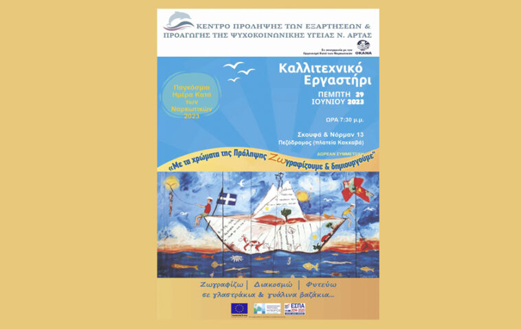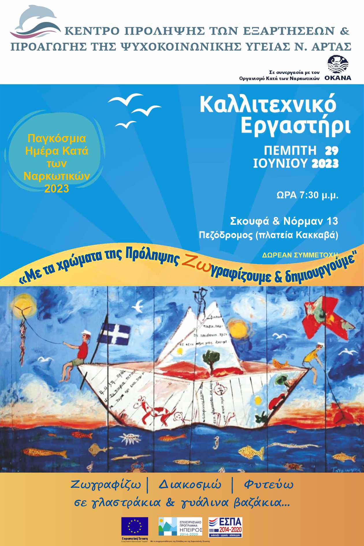 • Πέμπτη 29/6/2023 Δημιουργικό Εργαστήρι για παιδιά 7:30 μ.μ.- 9:30 μ.μ. με τίτλο: «Με τα χρώματα της Πρόληψης Ζωγραφίζουμε & δημιουργούμε» στην οδό Σκουφά & Νόρμαν 13 στον Πεζόδρομο (Πλατεία Κακκαβά).