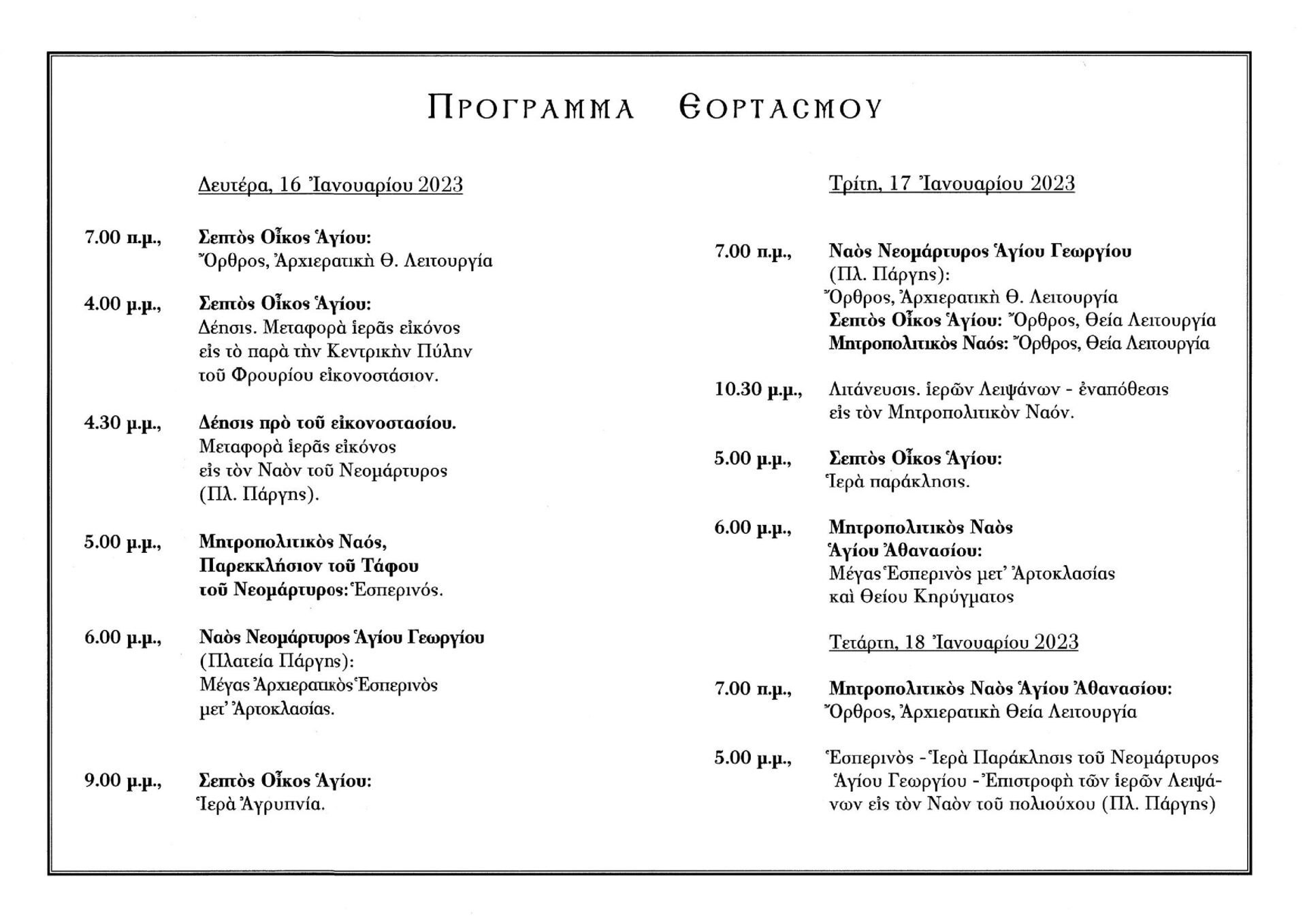 Την Δευτέρα 16 Ιανουαρίου, παραμονή της εορτής, και ώρα 6 μ.μ., θα τελεσθεί ο Μέγας Πανηγυρικός Αρχιερατικός Εσπερινός. Την κυριώνυμο ημέρα της εορτής, Τρίτη 17 Ιανουαρίου, και ώρα 7 π.μ. θα τελεσθεί ο Όρθρος και η Αρχιερατική Θεία Λειτουργία και στη συνέχεια στις 10:30 π.μ. η λαμπρά λιτανεία των Ιερών Λειψάνων του Αγίου και η εναπόθεσή τους στον Μητροπολιτικό Ναό του Αγίου Αθανασίου.