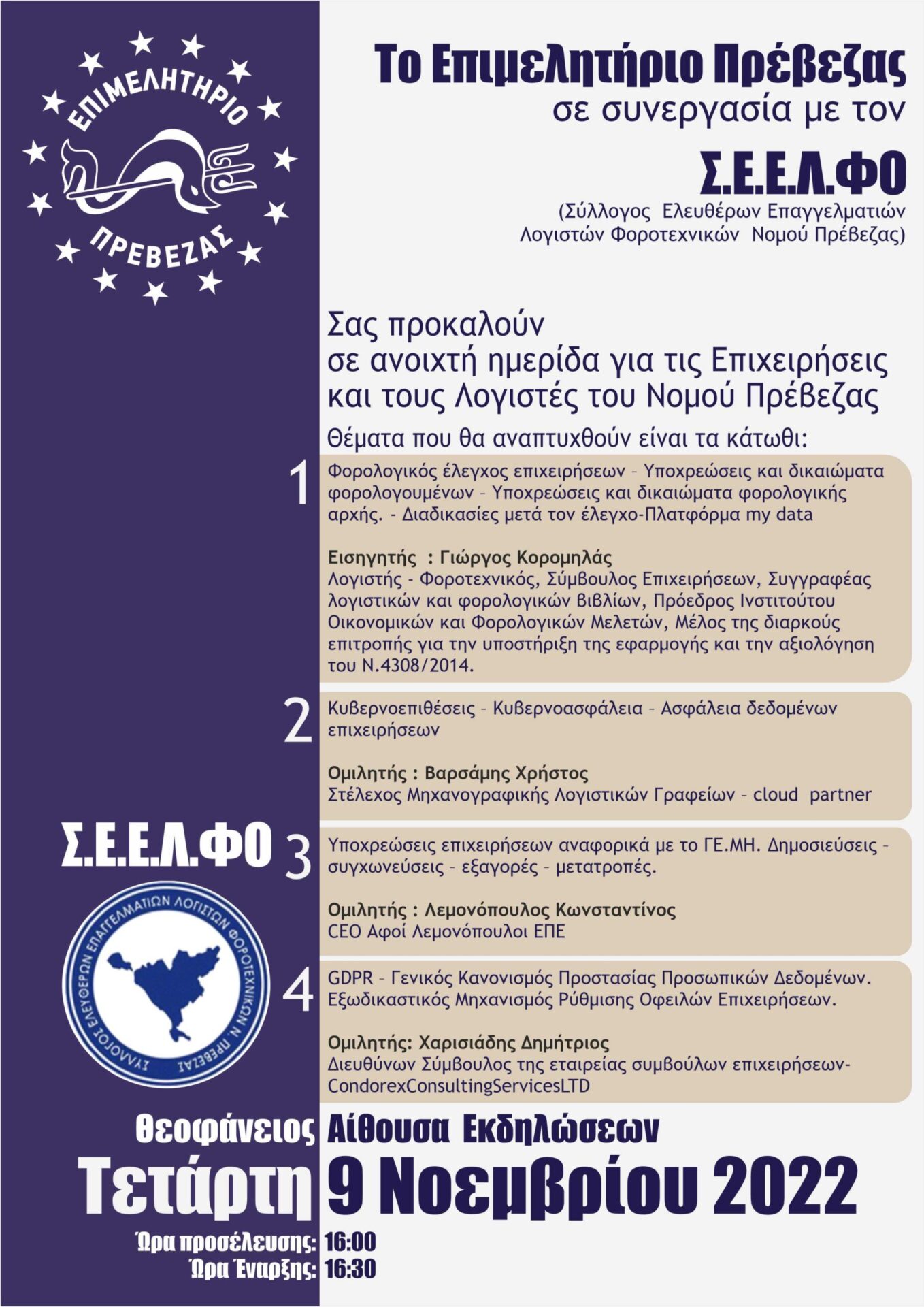 in Πρέβεζα Πρόσκληση σε Ανοιχτή Ημερίδα του Επιμελητηρίου Πρέβεζας για τα Φορολογικά Θέματα 8 Νοεμβρίου 2022, 13:25 Επιμελητήριο ΠρέβεζαςΗμερίδα See more Προηγούμενο άρθρο Κάλεσμα συμμετοχής στην 24ωρη απεργία της 9ης του Νοέμβρη | ΑΔΕΔΥ – Νομαρχιακό Τμήμα Άρτας Επόμενο άρθρο Κώστας Μπάρκας: Την Τετάρτη επιστρέφουμε στην κυβέρνηση Μητσοτάκη τον λογαριασμό
