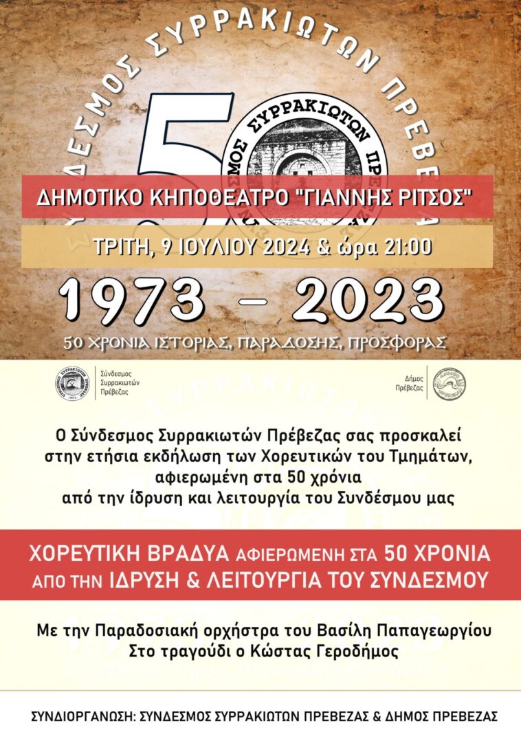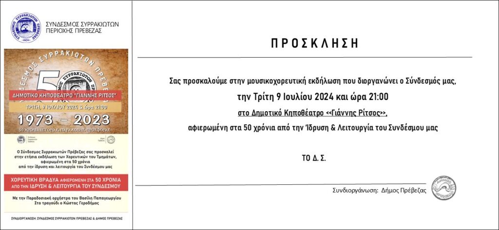 Ο Σύνδεσμος Συρρακιωτών Πρέβεζας σας προσκαλεί στην ετήσια μουσικοχορευτική εκδήλωση η οποία θα πραγματοποιηθεί την Τρίτη 9 Ιουλίου 2024 και ώρα 21:00 στο Δημοτικό Κηποθέατρο «Γιάννης Ρίτσος».