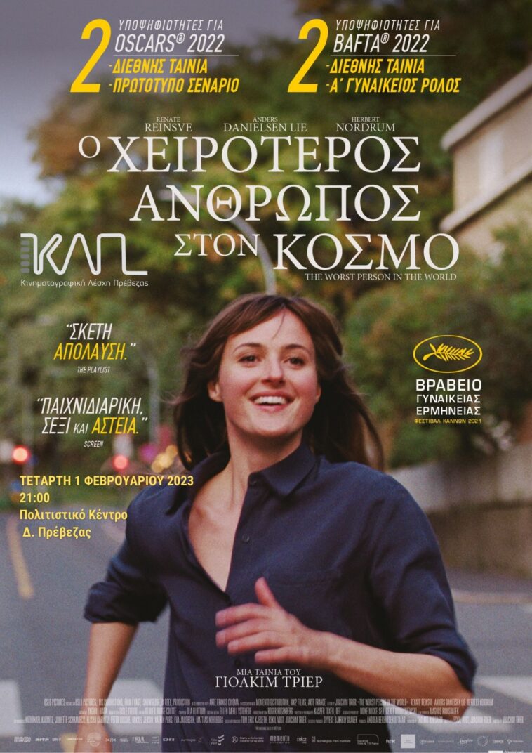 Η Κινηματογραφική Λέσχη πιστή στην προβολή ταινιών με κινηματογραφικό χαρακτήρα και αισθητική προβάλλει την Τετάρτη 1 Φεβρουαρίου 2023 2023(21:00) το συναρπαστικό κωμικό δράμα «Ο χειρότερος άνθρωπος στον κόσμο» του Γιόακιμ Τρίερ η οποία συγκέντρωσε πλήθος διακρίσεων, στο Πολιτιστικό Κέντρο του Δήμου Πρέβεζας με εισιτήριο 4 ευρώ για μαθητές και φοιτητές, 6 ευρώ γενική είσοδο, και δωρεάν είσοδο για ανέργους.