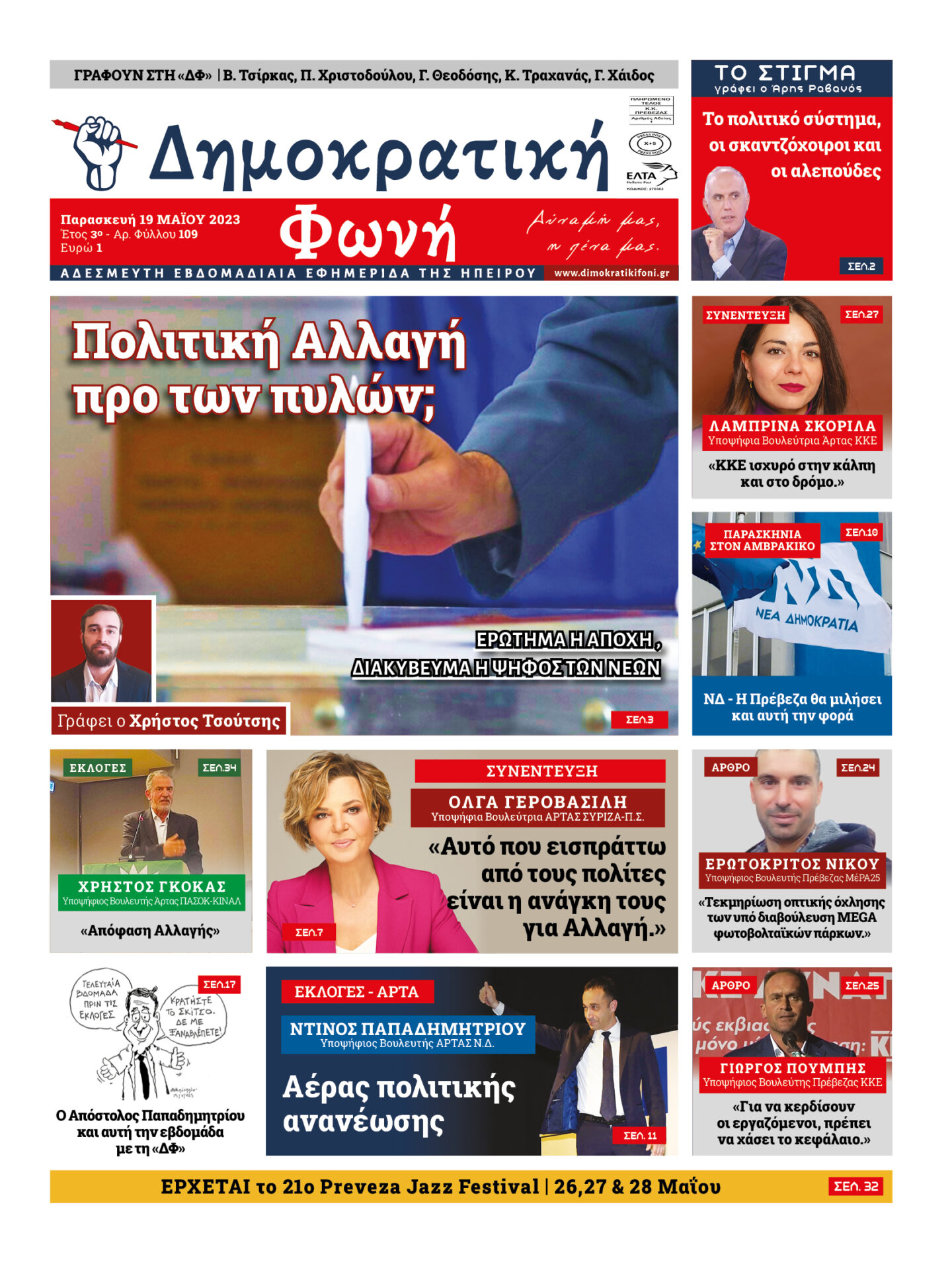 in Εφημερίδα Πρωτοσέλιδο – 109ο Φύλλο – Δημοκρατική Φωνή – 19 Μάϊου 2023 18 Μαΐου 2023, 10:07 Πρωτοσέλιδο See more Προηγούμενο άρθρο Γιώργος Δημητρίου : “Εμείς θα γίνουμε η αλλαγή που έχει ανάγκη ο τόπος – Εμείς θα κάνουμε ξανά τους Πρεβεζάνους περήφανους” Επόμενο άρθρο ΤΟ ΘΕΜΑ | Πολιτική Αλλαγή προ των πυλών;