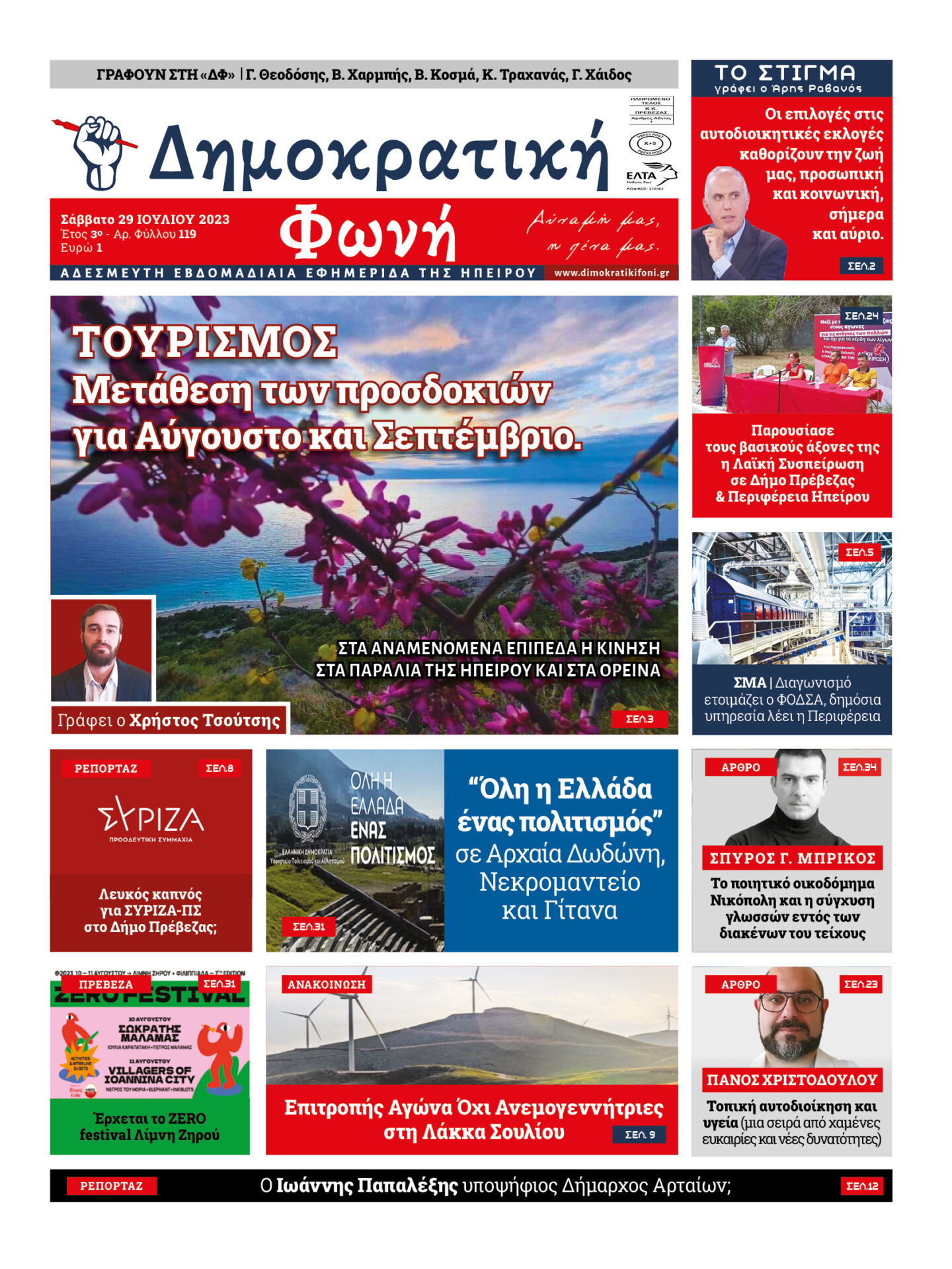 in Εφημερίδα Πρωτοσέλιδο – 119ο Φύλλο – Δημοκρατική Φωνή – 29 Ιουλίου 2023 29 Ιουλίου 2023, 09:22 Πρωτοσέλιδο See more Προηγούμενο άρθρο Δημοτικό Παραδοσιακό Γλέντι από την Τ.Ε. Πρέβεζας του ΚΚΕ Επόμενο άρθρο Μαρία Κεφάλα | Πρώτη επίσκεψη του Πρωθυπουργού στο νεοσύστατο Υπουργείο Κοινωνικής Συνοχής και Οικογένειας