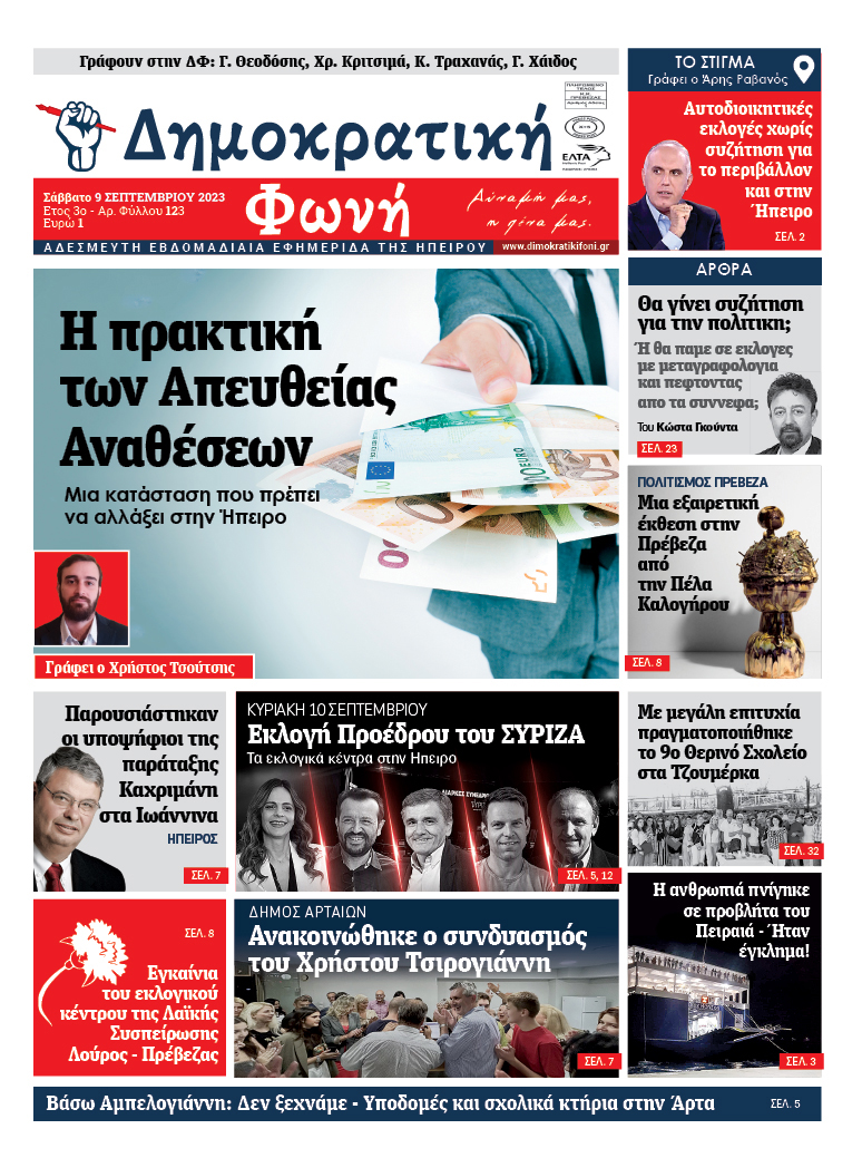 in Εφημερίδα, Ηπειρώτικος Καθρέφτης Πρωτοσέλιδο – 123ο Φύλλο – Δημοκρατική Φωνή – 9 Σεπτεμρβίου 2023 9 Σεπτεμβρίου 2023, 11:16 See more Προηγούμενο άρθρο Εκπαιδευτικό ταξίδι στο Κρατικό Μουσείο και Μνημείο του Άουσβιτς – Μπιρκενάου Επόμενο άρθρο Θανατηφόρο τροχαίο στο Φόρο – ηλικιωμένος παρασύρθηκε από ΙΧ