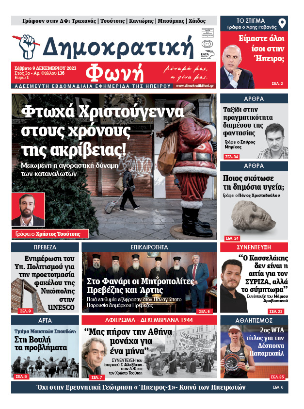 in Εφημερίδα, Ηπειρώτικος Καθρέφτης Πρωτοσέλιδο – 136ο Φύλλο – Δημοκρατική Φωνή – 9 Δεκεμβρίου 2023 9 Δεκεμβρίου 2023, 19:36 See more Προηγούμενο άρθρο ΣΤΕΛΕΧΩΣΗ ΔΙΕΘΥΝΣΗ ΔΑΣΩΝ ΠΡΕΒΕΖΑΣ- Σπύρος Κυριάκης Επόμενο άρθρο Μια βραδιά αφιερωμένη στον Γιάννη Θάνη
