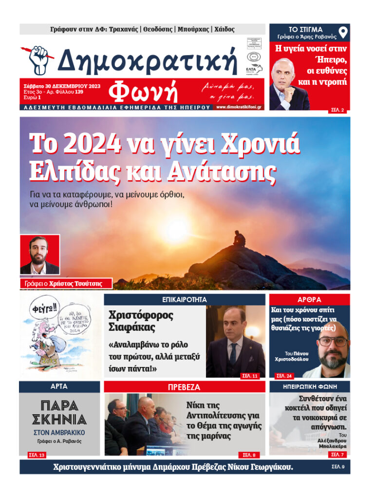 Πρωτοσέλιδο – 139ο Φύλλο – Δημοκρατική Φωνή – 30 Δεκεμβρίου 2023