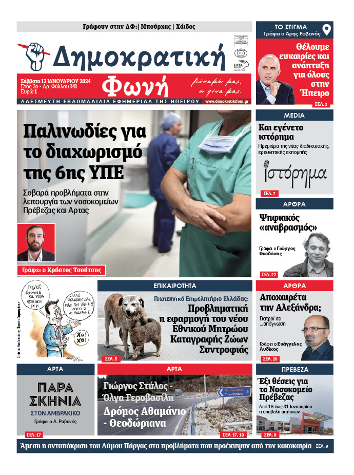 in Εφημερίδα, Ηπειρώτικος Καθρέφτης Πρωτοσέλιδο – 141ο Φύλλο – Δημοκρατική Φωνή – 13/1/2024 13 Ιανουαρίου 2024, 11:26 See more Προηγούμενο άρθρο Ορισμός εντεταλμένων Δημοτικών Συμβούλων Πάργας Επόμενο άρθρο Επαναλειτουργεί το Δημοτικό Κολυμβητήριο- Γραφείο Τύπου Δήμου Αρταίων