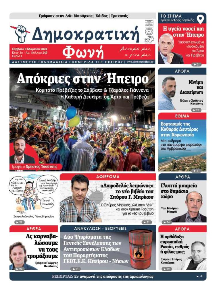 in Εφημερίδα, Ηπειρώτικος Καθρέφτης Πρωτοσέλιδο – 150ο Φύλλο – Δημοκρατική Φωνή – 16/3/2024 17 Μαρτίου 2024, 13:06 See more Προηγούμενο άρθρο Εορτασμός της Καθαρής Δευτέρας στην Κορωνησία Επόμενο άρθρο ΣΩΜΑΤΕΙΟ ΙΔΙΩΤΙΚΩΝ ΥΠΑΛΛΗΛΩΝ Ν. ΠΡΕΒΕΖΑΣ. Η Καθαρά Δευτέρα είναι αργία! Κυβέρνηση και Υπ. Εργασίας να σταματήσουν να πετάνε αετό και να κάνουν τα στραβά μάτια στην εργοδοτική ασυδοσία. Πληθαίνουν οι καταγγελίες