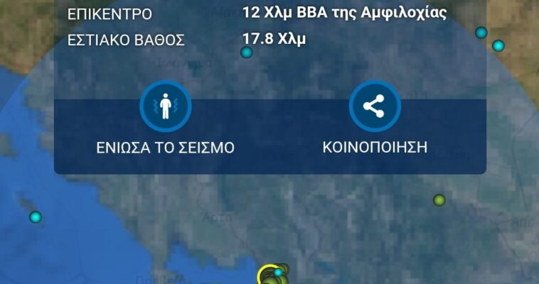 Σεισμός 4.6 Ρίχτερ με επίκεντρο 12 χιλιόμετρα Β-ΒΑ της Αμφιλοχίας σημειώθηκε στις 2.20 τα ξημερώματα της Τρίτης 21/03/2023.