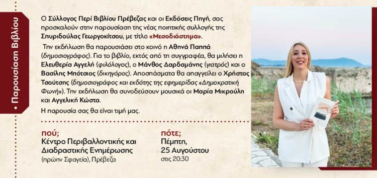 Ο Σύλλογος Περί Βιβλίου Πρέβεζας και οι Εκδόσεις Πηγή, σας προσκαλούν στην παρουσίαση της νέας ποιητικής συλλογής της Σπυριδούλας Γεωργοκίτσου, με τίτλο «Μεσοδιάστημα» την Πέμπτη 25 Αυγούστου στις 20:30 στο Κέντρο Περιβαλλοντικής και Διαδραστικής Ενημέρωσης (πρώην Σφαγεία).