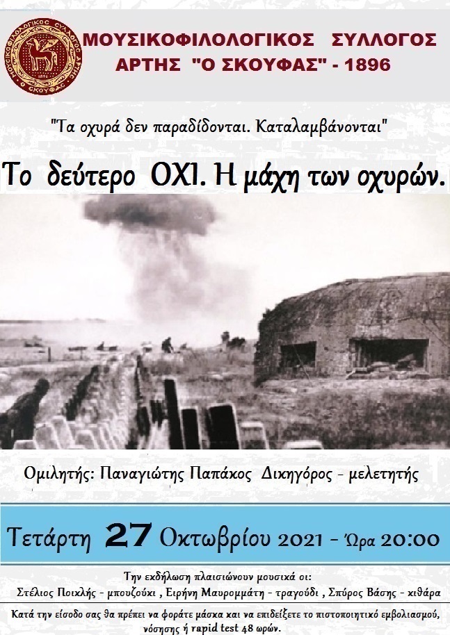Την Τετάρτη 27 Οκτωβρίου 2021 και ώρα 8.00 μ.μ. στην αίθουσα του Μ/Φ Συλλόγου Άρτης «Ο ΣΚΟΥΦΑΣ».