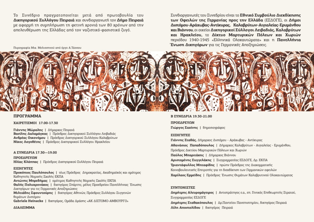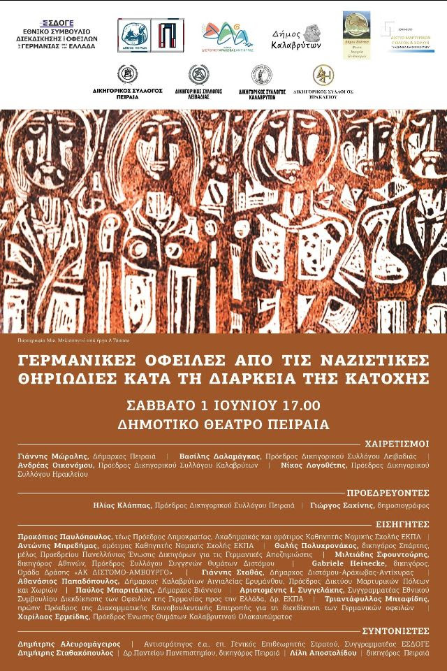 Με πρωτοβουλία του Δικηγορικού Συλλόγου Πειραιά και με συνδιοργανωτή το Δήμο Πειραιά, πραγματοποιήθηκε το Σάββατο 01-06-2024 στο Δημοτικό Θέατρο Πειραιά πανελλήνιο συνέδριο με θέμα «ΓΕΡΜΑΝΙΚΕΣ ΟΦΕΙΛΕΣ ΑΠΟ ΤΙΣ ΝΑΖΙΣΤΙΚΕΣ ΘΗΡΙΩΔΙΕΣ ΚΑΤΑ ΤΗ ΔΙΑΡΚΕΙΑ ΤΗΣ ΚΑΤΟΧΗΣ».