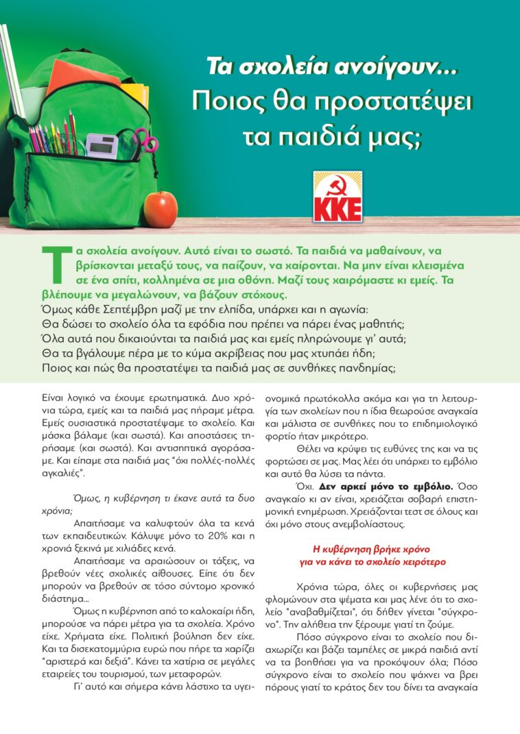 in Επικαιρότητα, Πολιτισμός & Παιδεία, Πρέβεζα Τ.Ο. Πρέβεζας του ΚΚΕ για την έναρξη της σχολικής χρονιάς 13 Σεπτεμβρίου 2021, 13:40 See more Προηγούμενο άρθρο Ομαλά το πρώτο κουδούνι στα σχολεία της Άρτας Μήνυμα της Δημοτικής Αρχής στην εκπαιδευτική κοινότητα: ο Δήμος μας είναι παρόν σε κάθε πρόβλημα που προκύπτει. Επόμενο άρθρο Ο Μάριος Κάτσης για την έναρξη της σχολικής χρονιάς από το Δημοτικό Σχολείο Γραικοχωρίου και το 2ο ΓΕΛ Ηγουμενίτσας