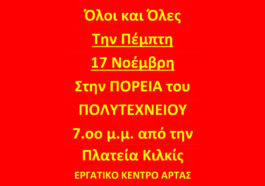 ΚΑΛΕΣΜΑ ΤΟΥ ΕΡΓΑΤΙΚΟΥ ΚΕΝΤΡΟΥ ΑΡΤΑΣ | Η ιστορία γράφεται με ανυπακοή – Όλες και όλοι στην Πορεία για την επέτειο του Πολυτεχνείου – Πέμπτη 17 Νοέμβρη στις 7.00 μ.μ. από την πλατεία Κιλκίς