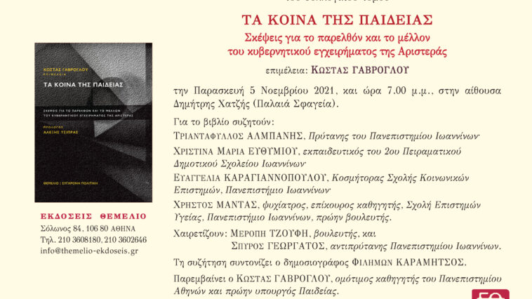 Οι εκδόσεις ΘΕΜΕΛΙΟ διοργανώνουν παρουσίαση του συλλογικού τόμου ΤΑ ΚΟΙΝΑ ΤΗΣ ΠΑΙΔΕΙΑΣ – Σκέψεις για το παρελθόν και το μέλλον του κυβερνητικού εγχειρήματος της Αριστεράς