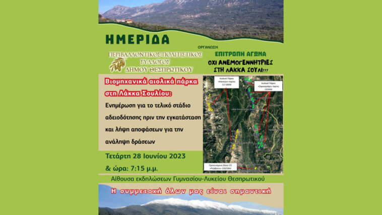 Κοινό Δ.Τ. εκ μέρους του Περιβαλλοντικού – Πολιτιστικού Συλλόγου π.Δήμου Θεσπρωτικού και της Επιτροπής Αγώνα Όχι Ανεμογεννήτριες στη Λάκκα Σουλίου & το Δήμο Ζηρού