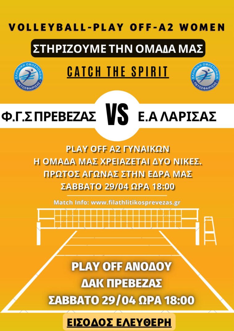 Η ομάδα της Πρέβεζας υποδέχεται το Σάββατο 29 Απριλίου στις 6 το απόγευμα στο ΔΑΚ Πρέβεζας την ομάδα της Ε.Α Λάρισας, η οποία τερμάτισε στην 4η θέση του βαθμολογικού πίνακα.