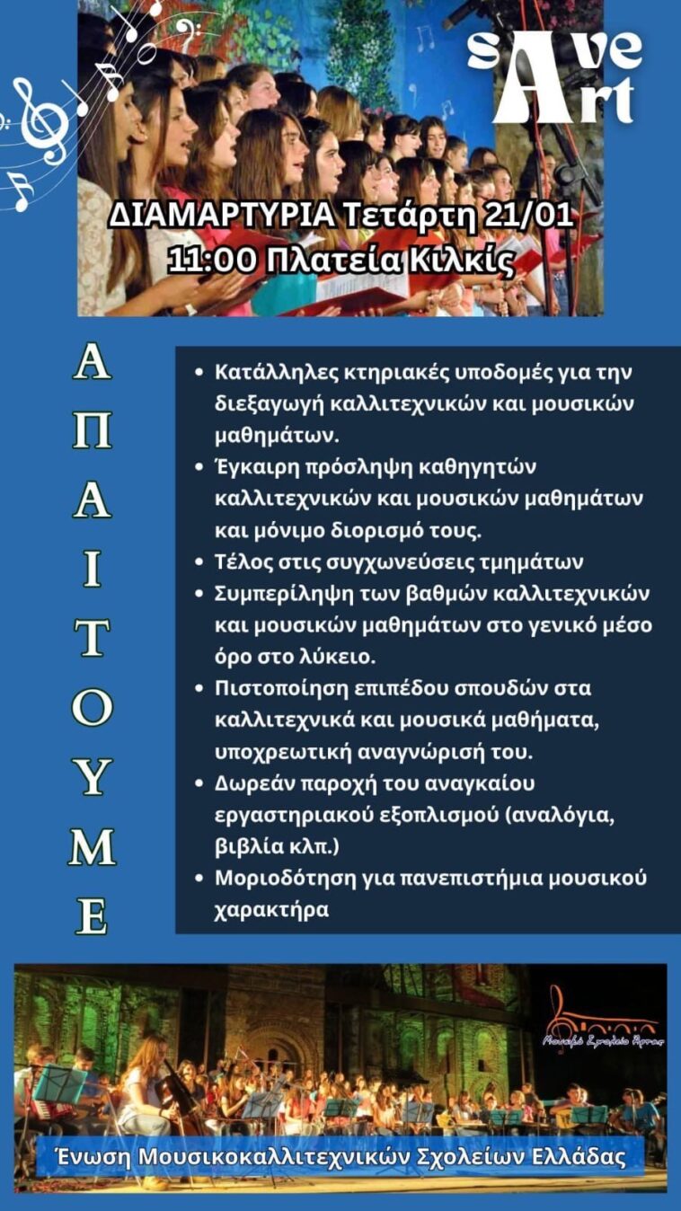 Το 15μελες του Μουσικού Σχολείου Άρτας ενώνει τη φωνή του με τους μαθητές, τους γονείς και τους εκπαιδευτικούς των μουσικών και καλλιτεχνικών σχολείων Ελλάδος. Στα πλαίσια των πανελλήνιων δράσεων μουσικών και καλλιτεχνικών σχολείων SAVE ART οι μαθητές του μουσικού σχολείου Άρτας θα πραγματοποιήσουν πορεία διαμαρτυρίας την Τετάρτη 21 Ιανουαρίου 11:00π.μ. στην πλατεία Κιλκίς.