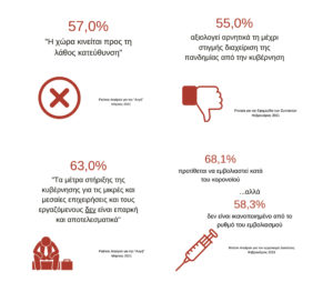 • Η κυβέρνηση φαίνεται ότι πληρώνει επικοινωνιακά την επιλογή της να επενδύσει αποκλειστικά στον εμβολιασμό, αφού οι αργοί ρυθμοί στην πρόοδο της διαδικασίας δεν ανταποκρίνονται στις προσδοκίες που έχουν καλλιεργηθεί, ενώ η γενικότερη ρητορική περί ανευθυνότητας των πολιτών, αλλά και η επένδυση στην καταστολή ως μοναδικό μέτρο ανάσχεσης της πανδημίας, με αποκορύφωμα τα γεγονότα στις πλατείες, και κυρίως στη Νέα Σμύρνη, όξυναν ακόμα περισσότερο την ατμόσφαιρα εις βάρος της κυβέρνησης.