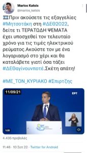 “Πριν ακούσετε τις εξαγγελίες #Μητσοτάκη στη #ΔΕΘ2022, δείτε τι ΤΕΡΑΤΩΔΗ ΨΕΜΑΤΑ έχει υποσχεθεί τον τελευταίο χρόνο για τις τιμές ηλεκτρικού ρεύματος. Ακούστε τον με ένα λογαριασμό στο χέρι και θα καταλάβετε γιατί όσα τάξει #ΔΕΘαγίνουνποτέ.Σκέτη απάτη!”