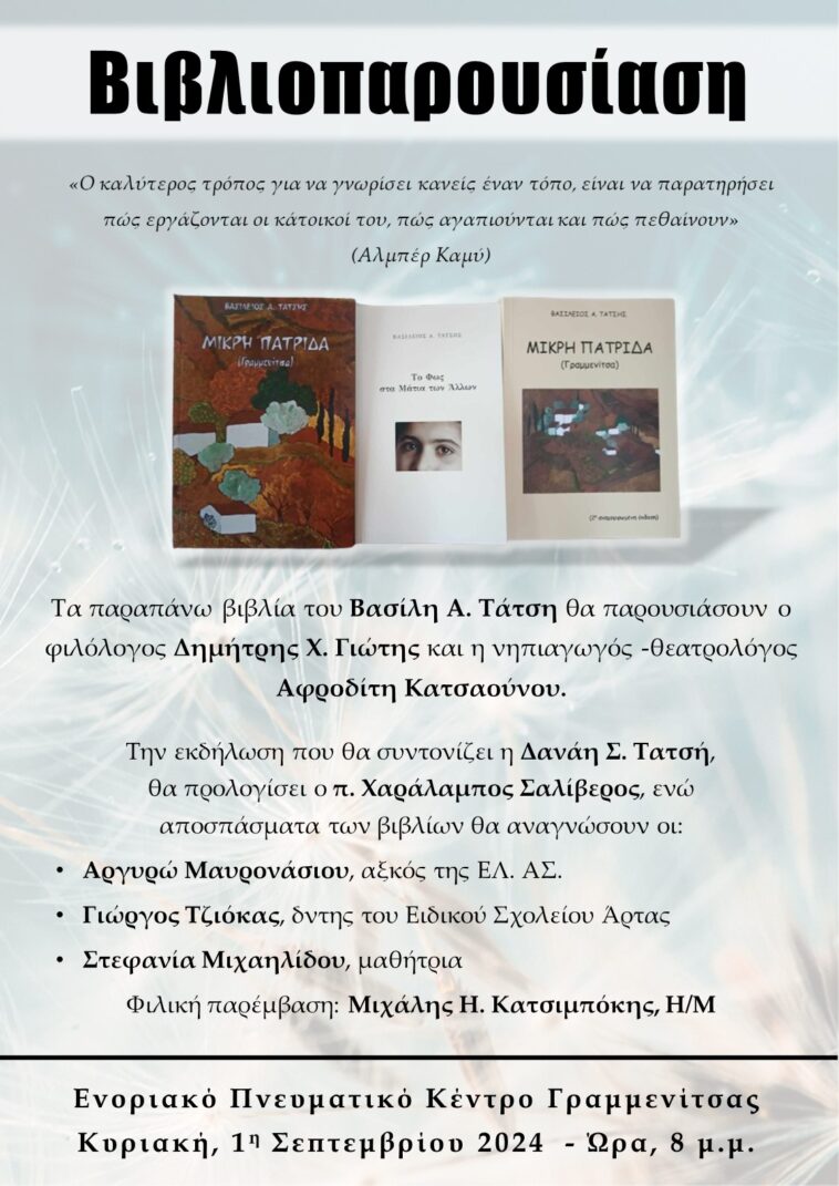 Την Κυριακή 1 Σεπτεμβρίου 2024, και ώρα 20:00’ μμ, στο Ενοριακό – Πνευματικό Κέντρο του Ι. Ν. Αγ. Δημητρίου Γραμμενίτσας, θα γίνει παρουσίαση των δύο βιβλίων του Βασίλη Α. Τάτση: