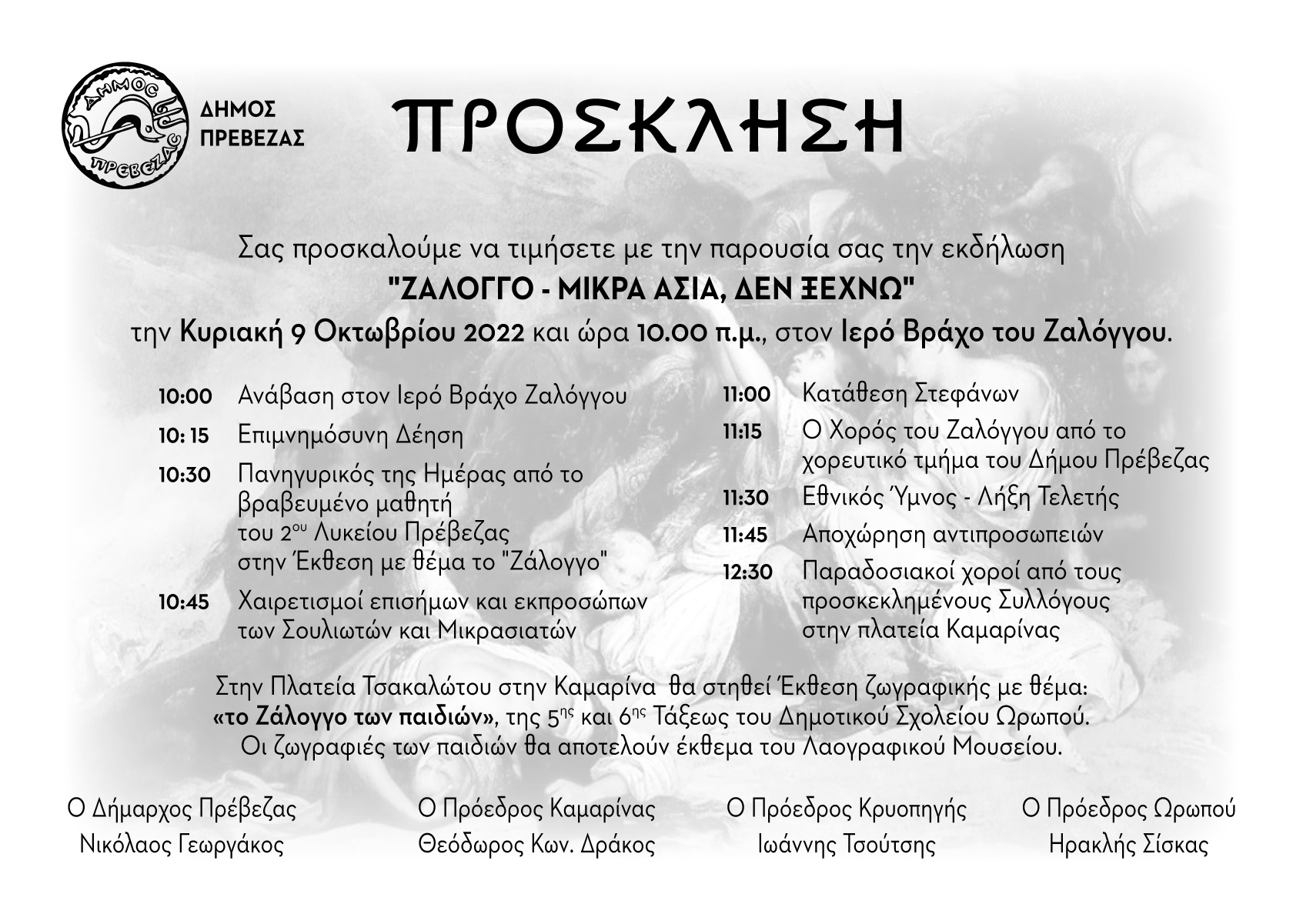 in Πρέβεζα “ΖΑΛΟΓΓΟ-ΜΙΚΡΑ ΑΣΙΑ, ΔΕΝ ΞΕΧΝΩ” – Κυριακή 9 Οκτωβρίου 4 Οκτωβρίου 2022, 13:30 ΖάλογγοΜικρά Ασία See more Προηγούμενο άρθρο Παγκόσμια Ημέρα των ζώων – δράσεις ευαισθητοποίησης και η πορεία του νέου καταφυγίου Επόμενο άρθρο Ενημέρωση από τη ΔΕΥΑ Πρέβεζας